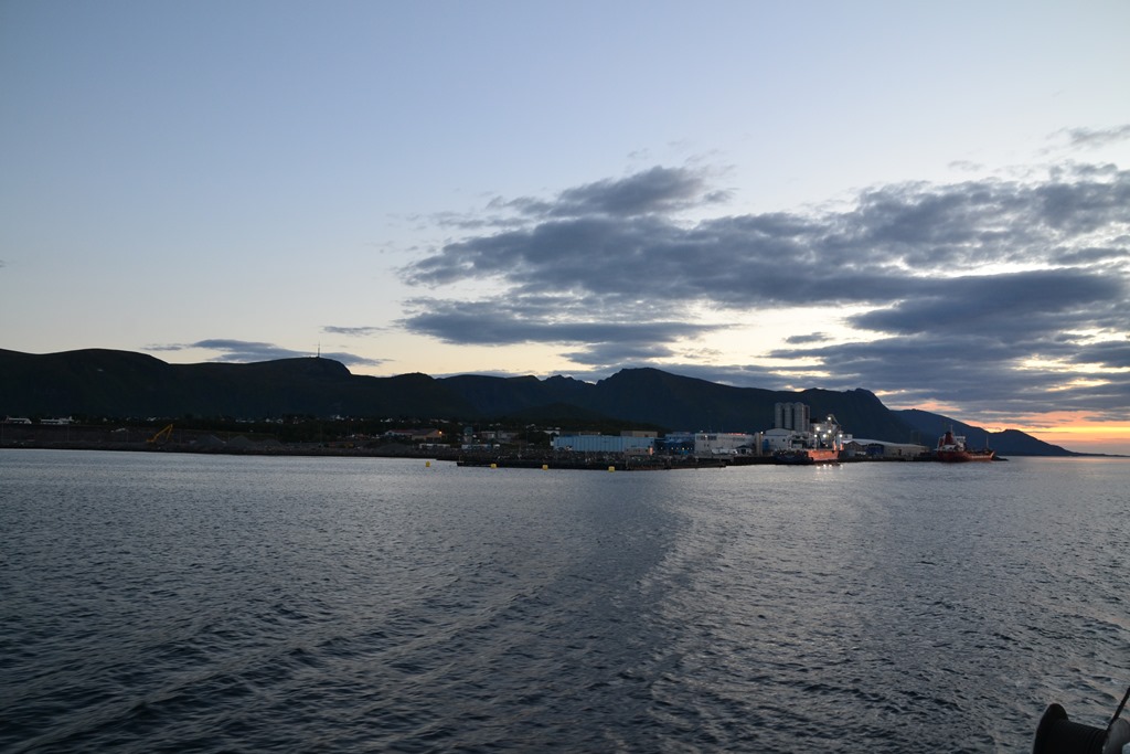 20:00 Kommer på vakt när vi närmar oss Stokkmarknes och det är en fin solnedgång.