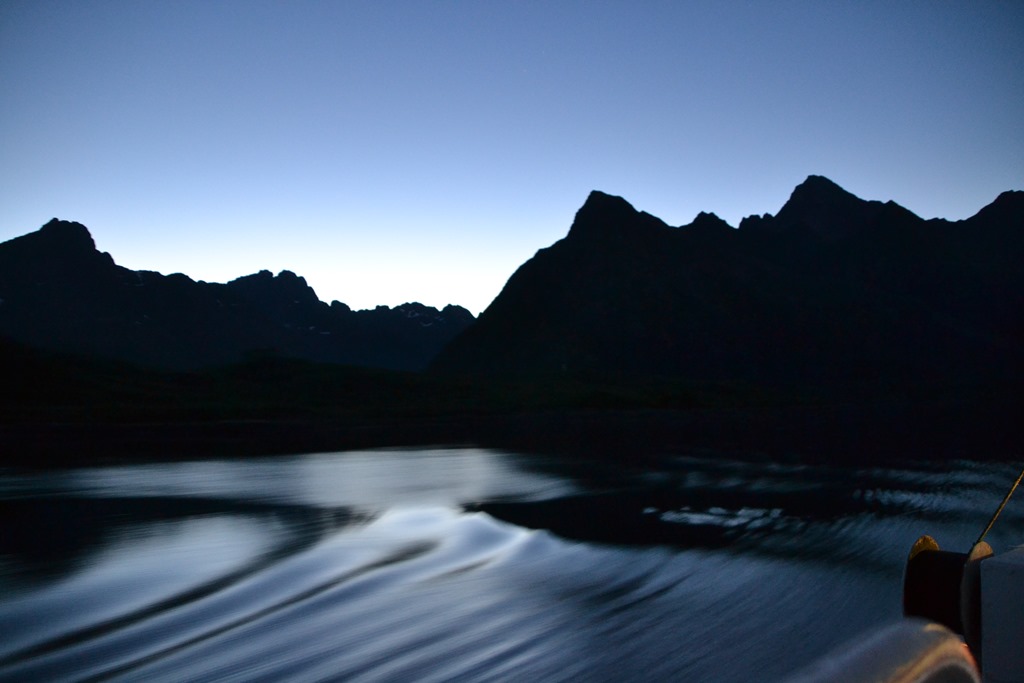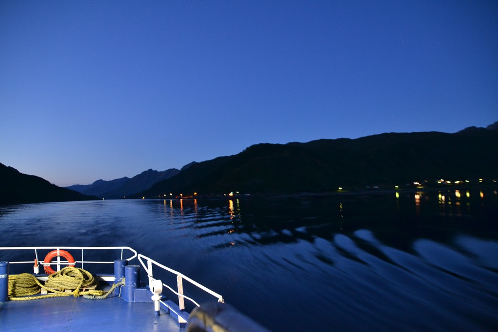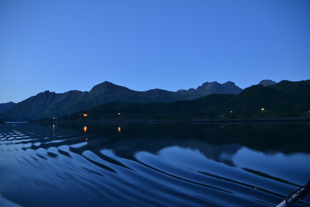Fortsätter sedan ner genom Raftsundet. Hade hoppats på norrsken nu när det är så klart. Men prognoserna är dåliga och det är fullmåne så det blir ganska ljust.