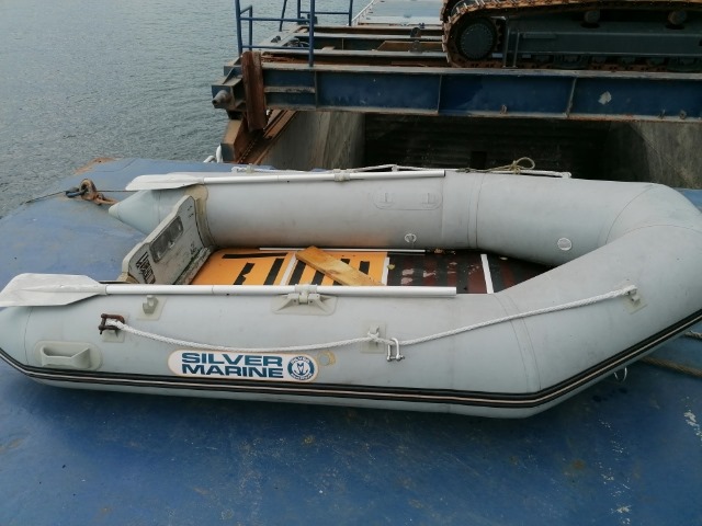14:45 Anker kallar på mig och vill att jag kommer upp. Det ligger tydligen en gummibåt och flyter i fjorden. Vi kör upp till den och ser att den är tom men att det ligger ett fiskespö vid kanten och blir oroliga att kanske någon ramlat överbord. Vi stannar till och plockar upp den med vår grävmaskin. Ser då att det inte är någon lina eller drag på spöt. Ringer till NOR VTS och sedan till Sjöräddningen och meddelar vad vi funnit. De har inte fått rapporterat någon saknad och skall göra efterforskning om någon saknar en gummibåt. Så vi tar med den in i land.