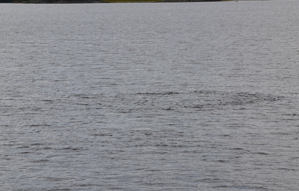 Ser sedan hur det nästan kokar i vattnet av småsill som jagas av stor makrill.