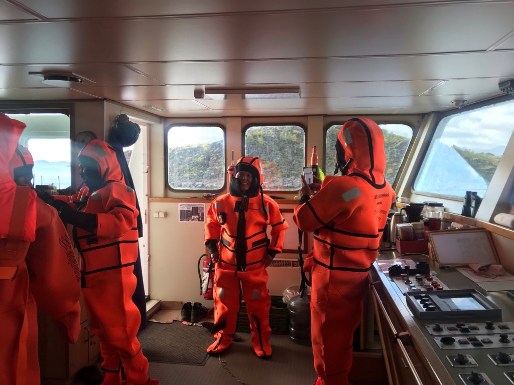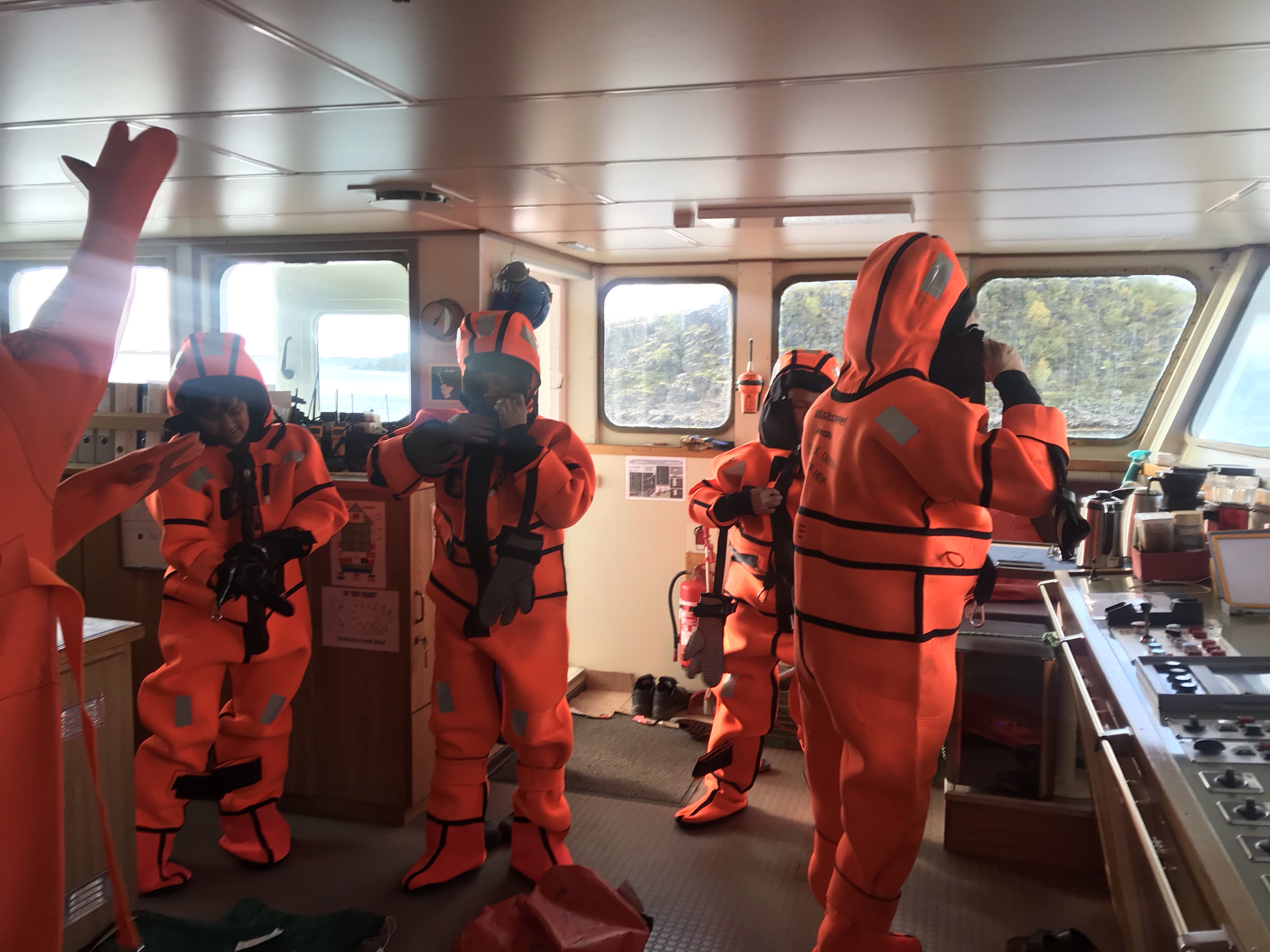 14:00 Efter maten så genomför vi lite övningar. Börjar med en Abandon Ship Drill där alla skall ta på sig överlevnads dräkter och göra sig klara att lämna fartyget.