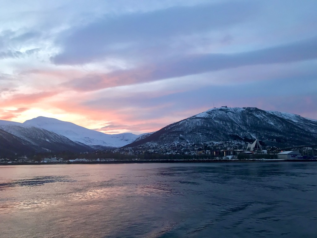 08:00 Kommer på vakt när vi passerar Tromsö. Stilla och fint väder trots att det är lite molnigt.
