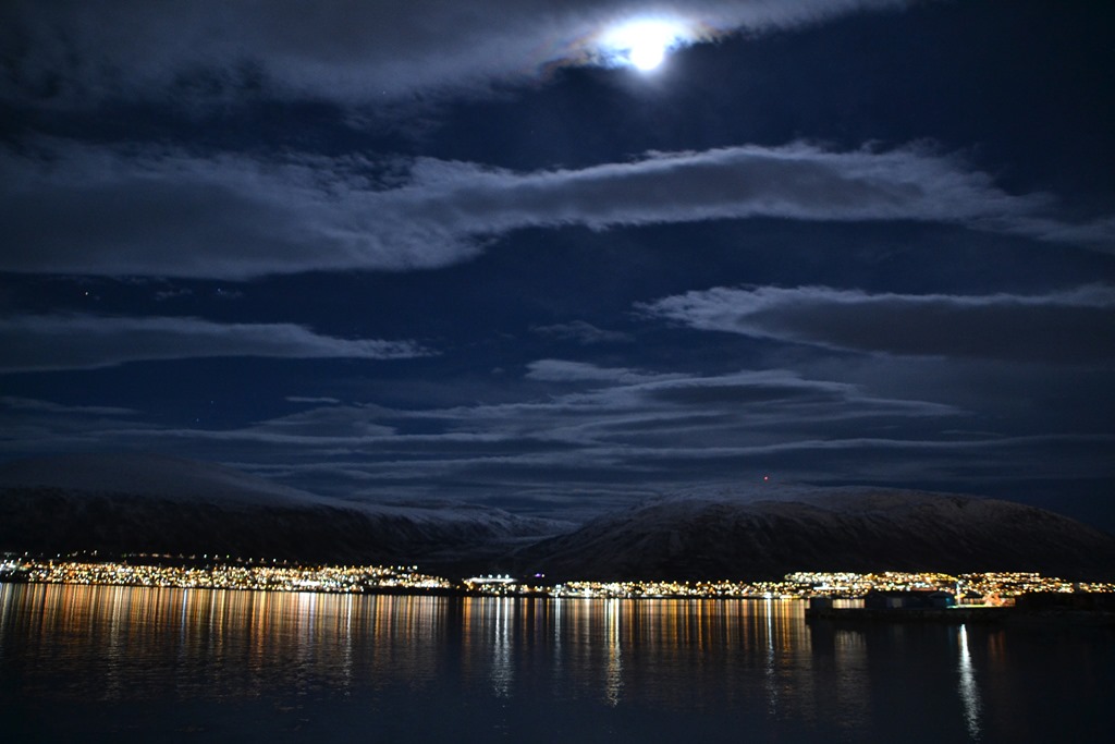 20:00 Kommer på vakt i Grötsundet och går sakta mot Tromsö. Lite svagt norrsken innan fullmånen kommer upp.