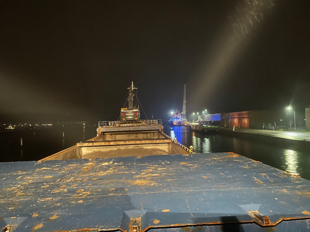 16:40 Förtöjda i Vejle och börjar lossa.