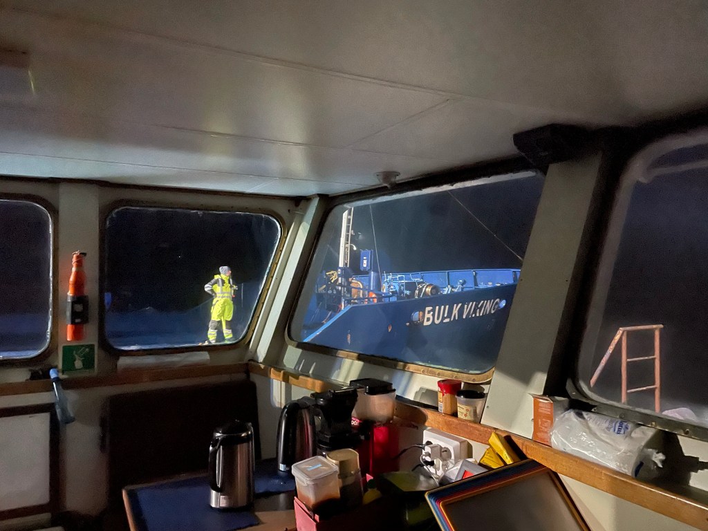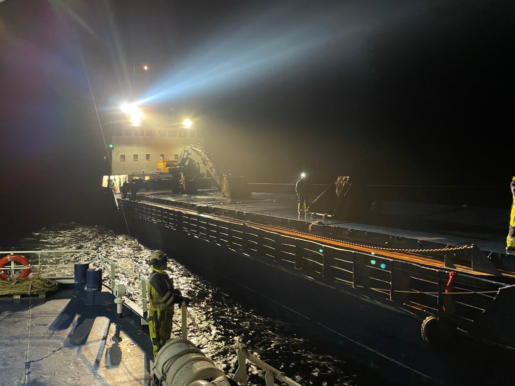 23:45-24:00 Möte med Bulk Viking för att få våran reserv skopa till grävmaskinen. Jag kör sakta framåt medan de kommer upp på sidan så att vi kan lyfta ombord skopan.