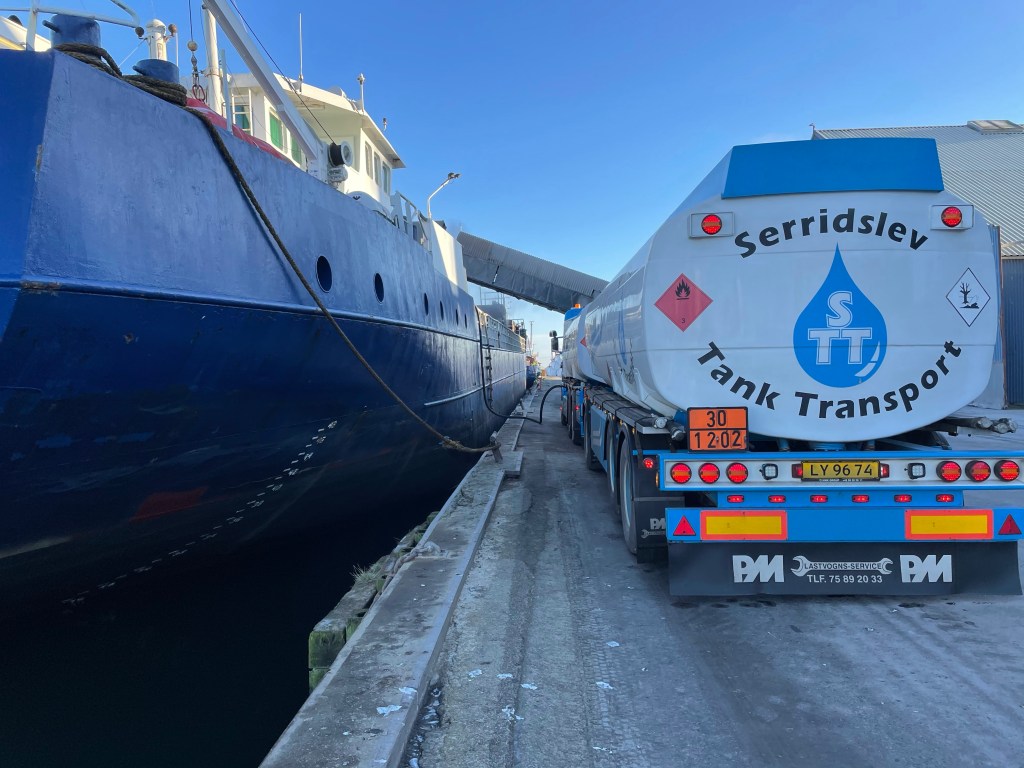11:45 Vi börjar lasta och samtidigt kommer lastbilen med bunkers. Så nu får vi 30 m3 ny diesel.