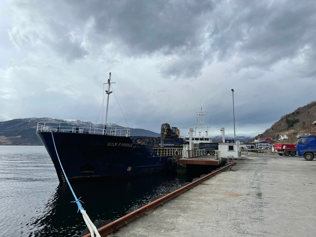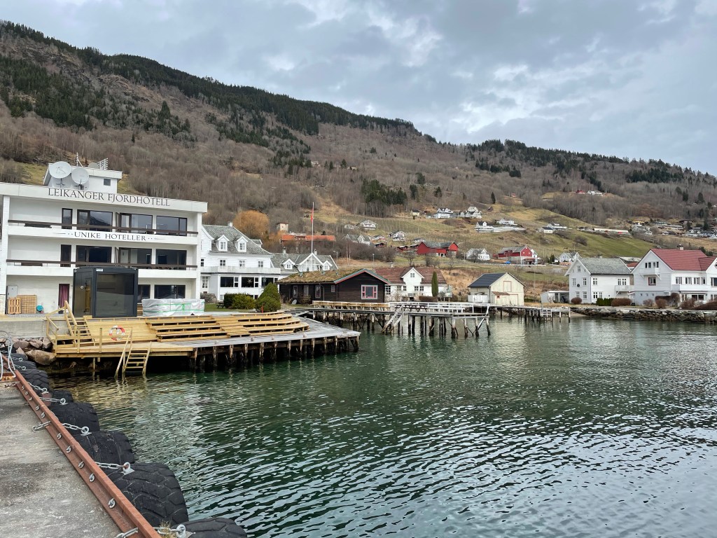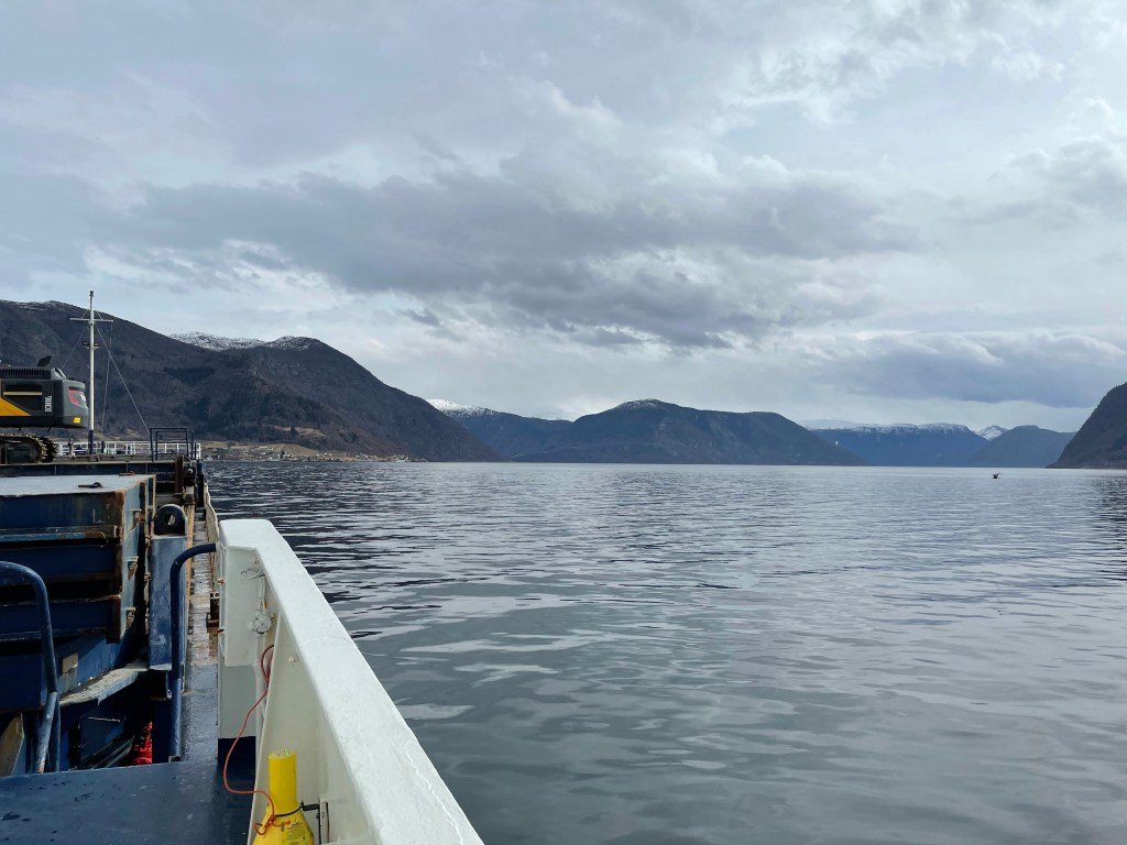 12:15 Förtöjda i Leikanger och börjar lossa. Grått och trist väder idag men det är vackert här inne.