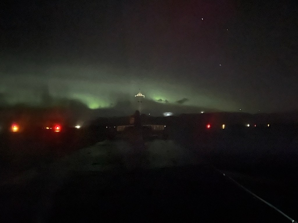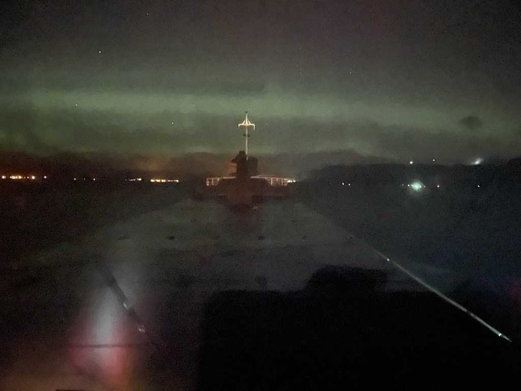 Efter midnatt när vi passerar Florø så blir det lite norrsken.