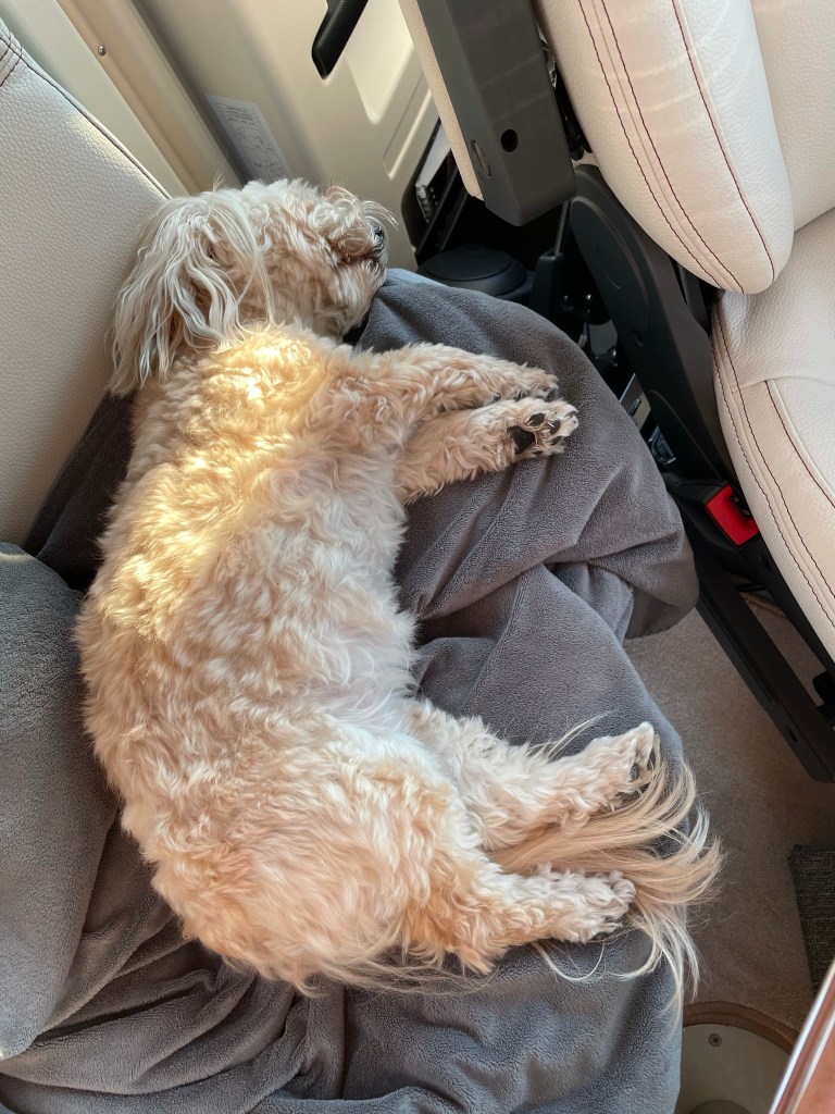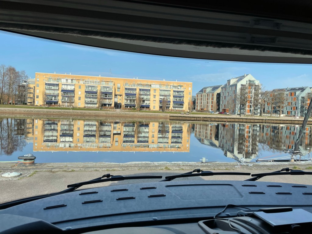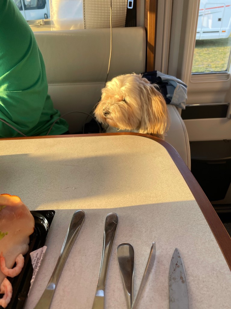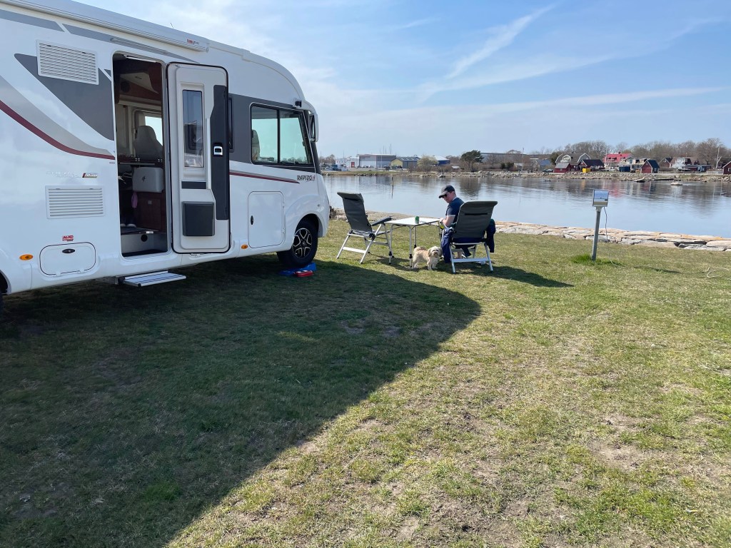 Vi tog sedan en lång promenad längs hamnen. Men på vägen tillbaka så började det blåsa lite och vinden är riktigt kall. Jag satt kvar utanför men Chili och Britta gick in. Chili stortrivs verkligen ute med husbilen.
