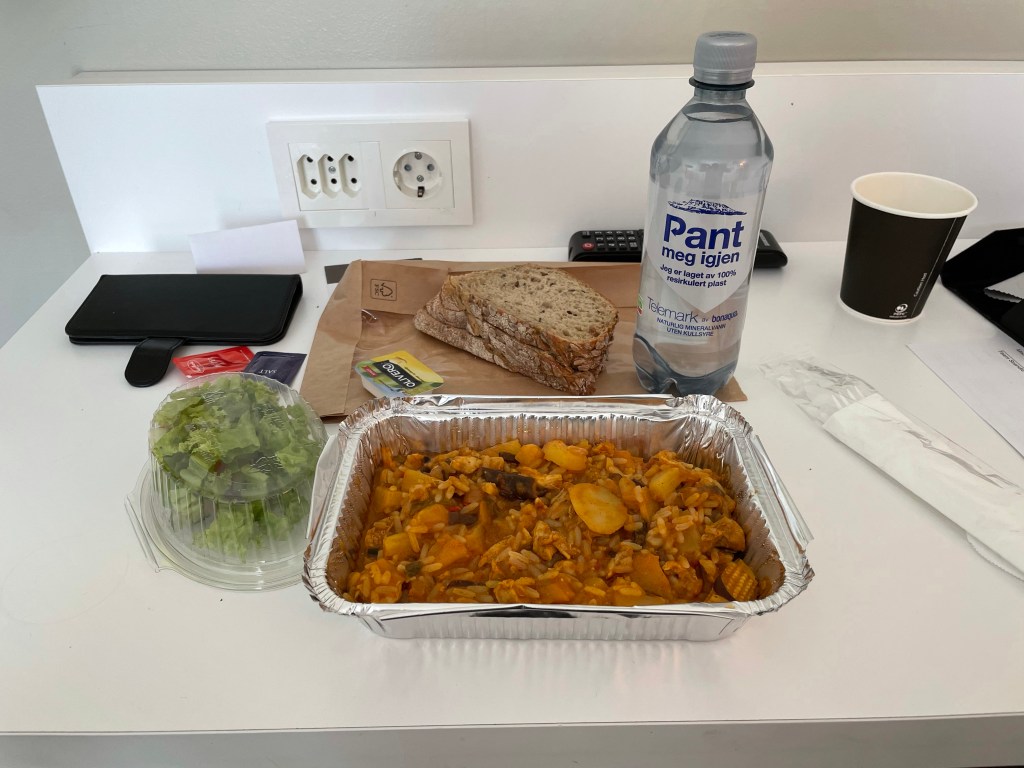Är sedan bara att vänta på middagen som serveras klockan 18 utanför dörren. Den var inget vidare så jag åt bara laxen som låg i portionen. Men det fanns en bit drömrulltårta som smakade bra till lite kaffe.