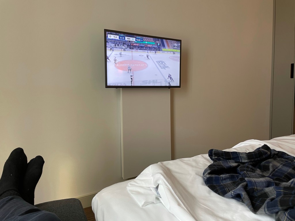 På väg tillbaka så tar jag mig en kopp kaffe och sätter mig för att se Hockey finalen Växjö-Rögle.