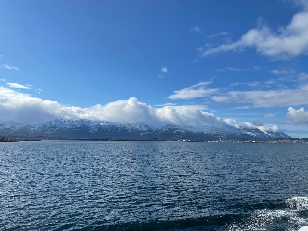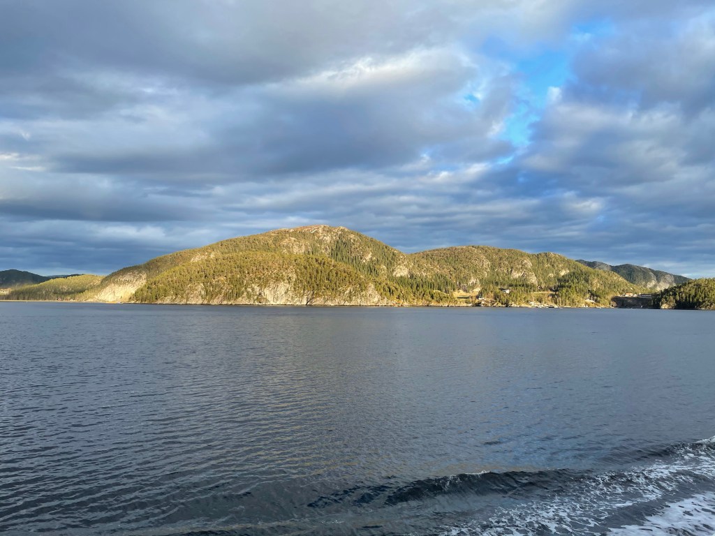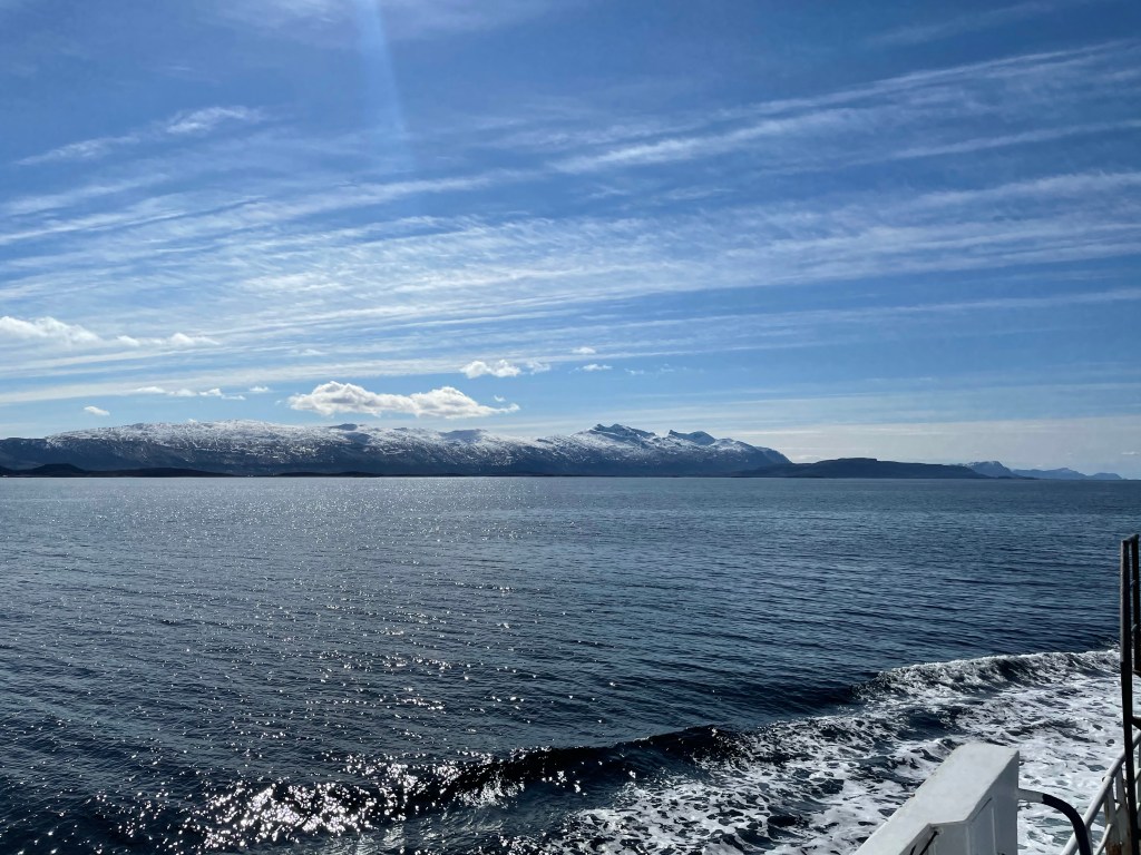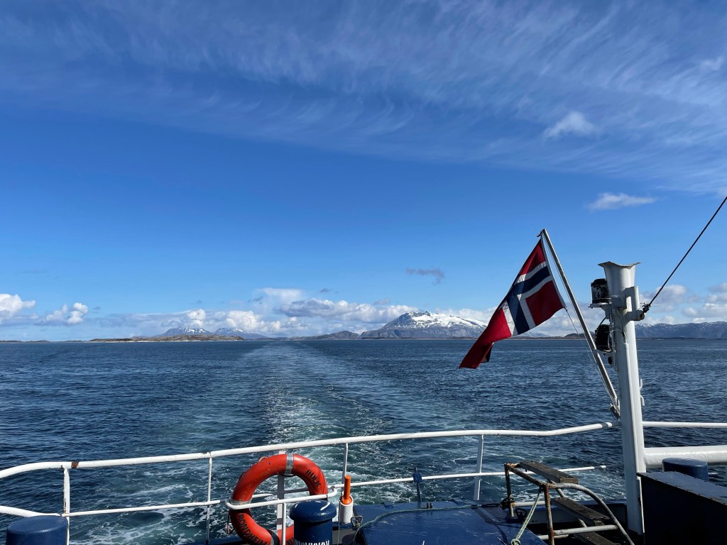 08:00 Kommer på vakt ute i Ranafjorden. Fortsätter söderut förbi Sandnessjøen och De Syv Søstrer som är molnklädda.