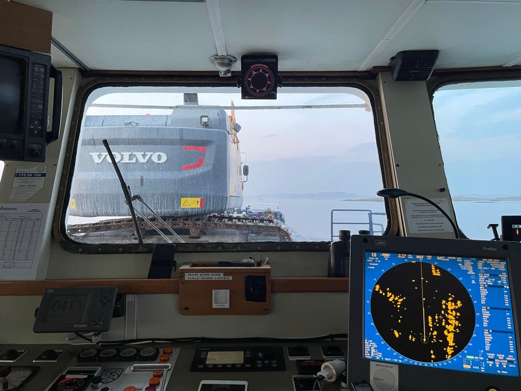 Idag blev det lite dålig last. Vi skulle ha 1200 ton 11-16 singel och 1000 ton 8-11 singel. Detta gör att vi ligger med en hel del förligt trim. Då ställer vi grävmaskinen längst akter för att gå bättre trim. Men då blir ju sikten betydligt sämre.