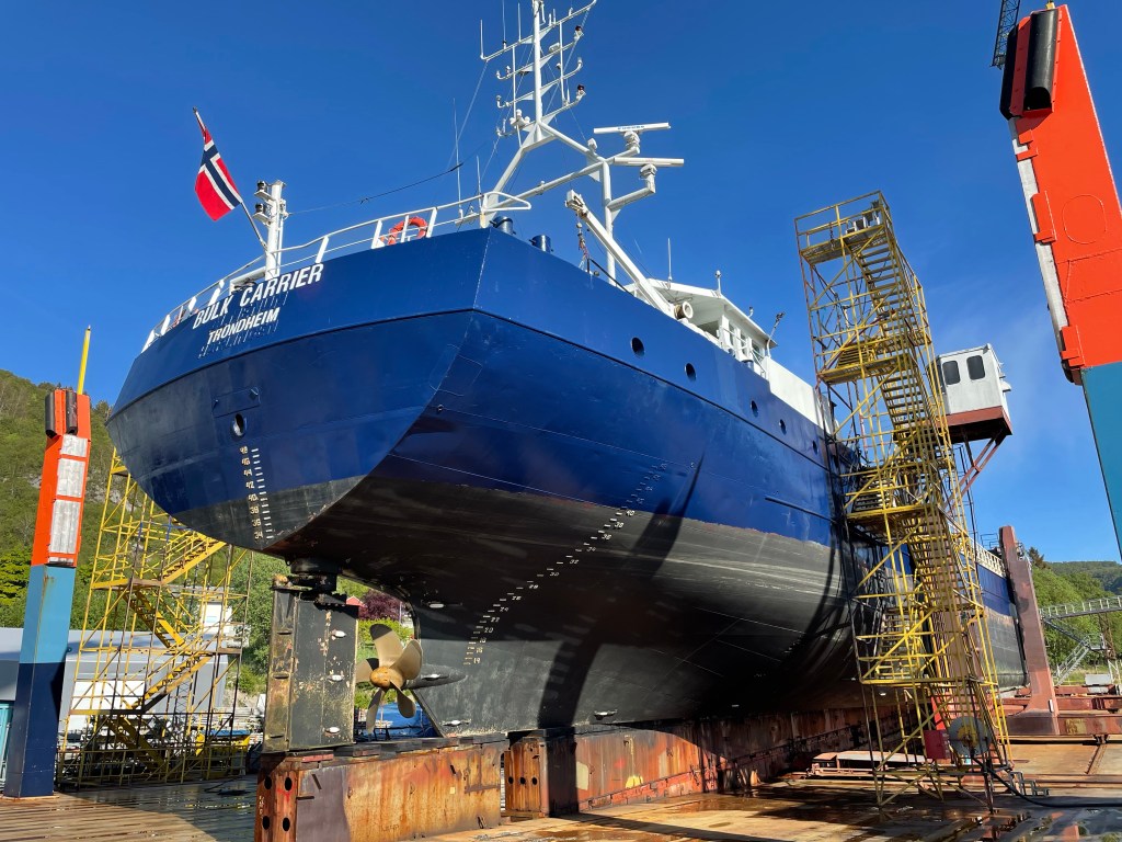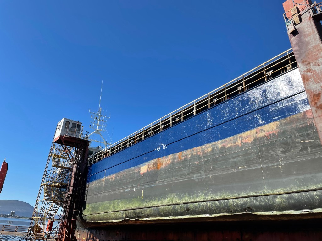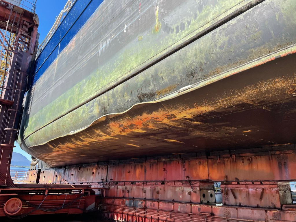 15:45 Vi är helt uppe ur vattnet och de börjar rigga till landgång. Sedan kan jag gå ner och inspektera och prata med varvschefen.
