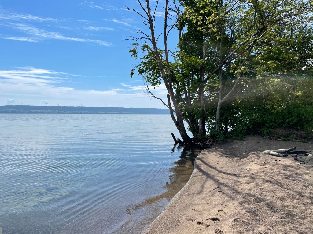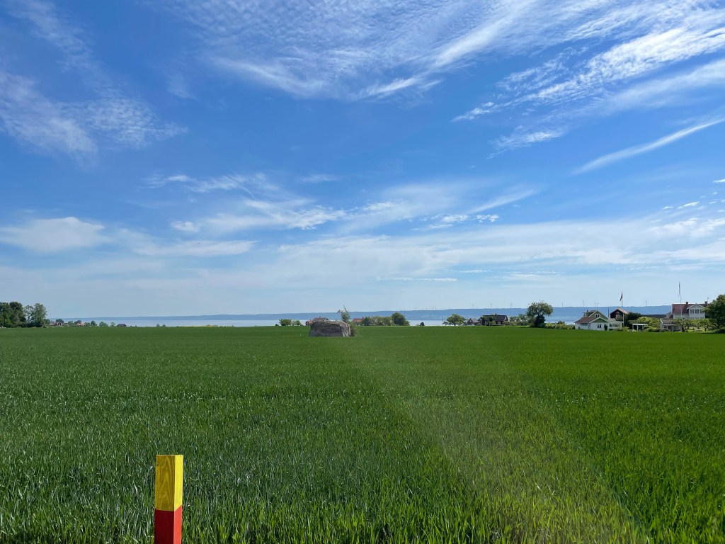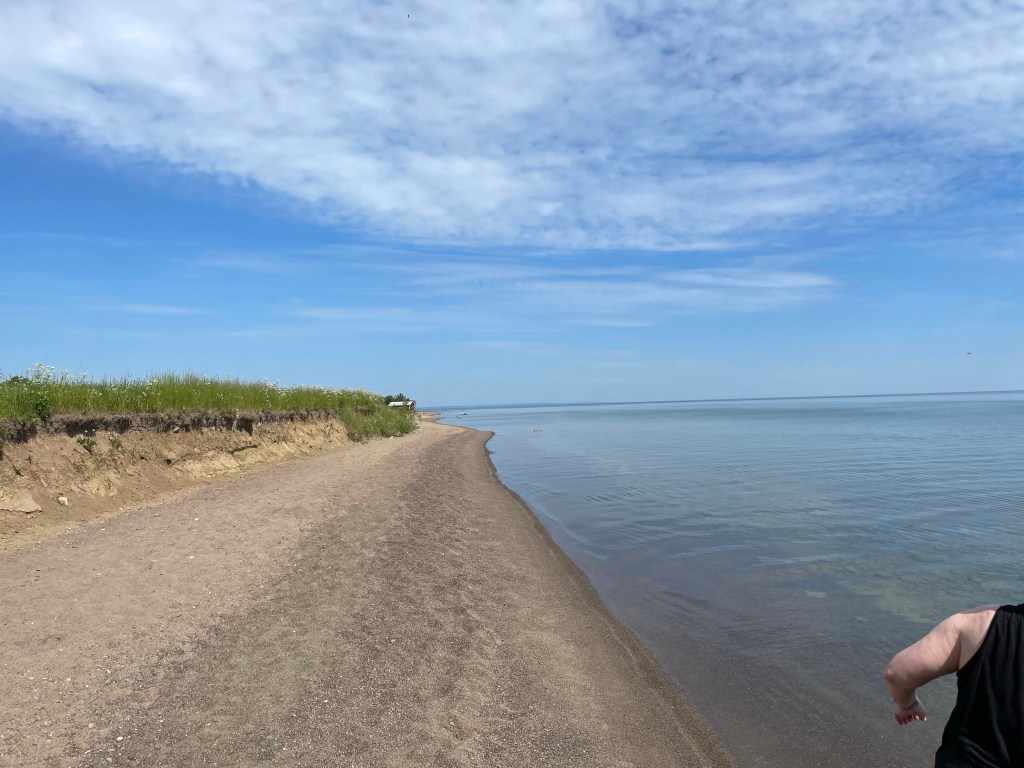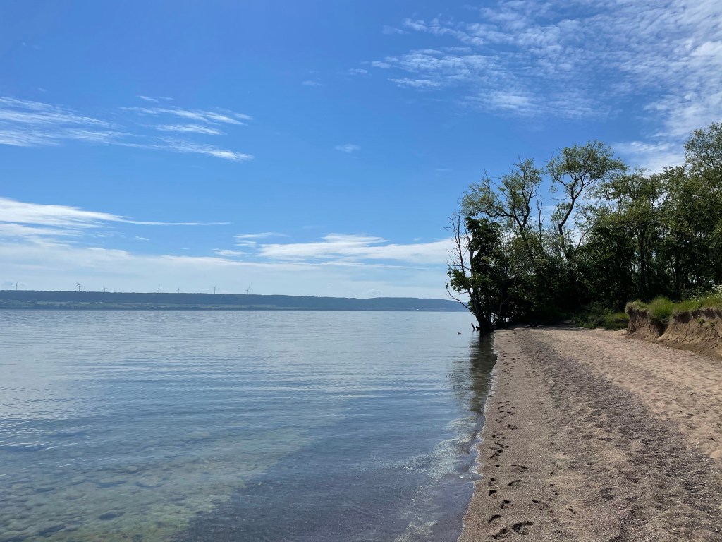Vi fortsätter norrut mot Sandudden. Till slut efter 9,7 km cykling är vi framme och går ner till den fina stranden. Ser på en skylt att man gärna får fricampa här med husbil bara man inte lämnar massa skräp efter sig.