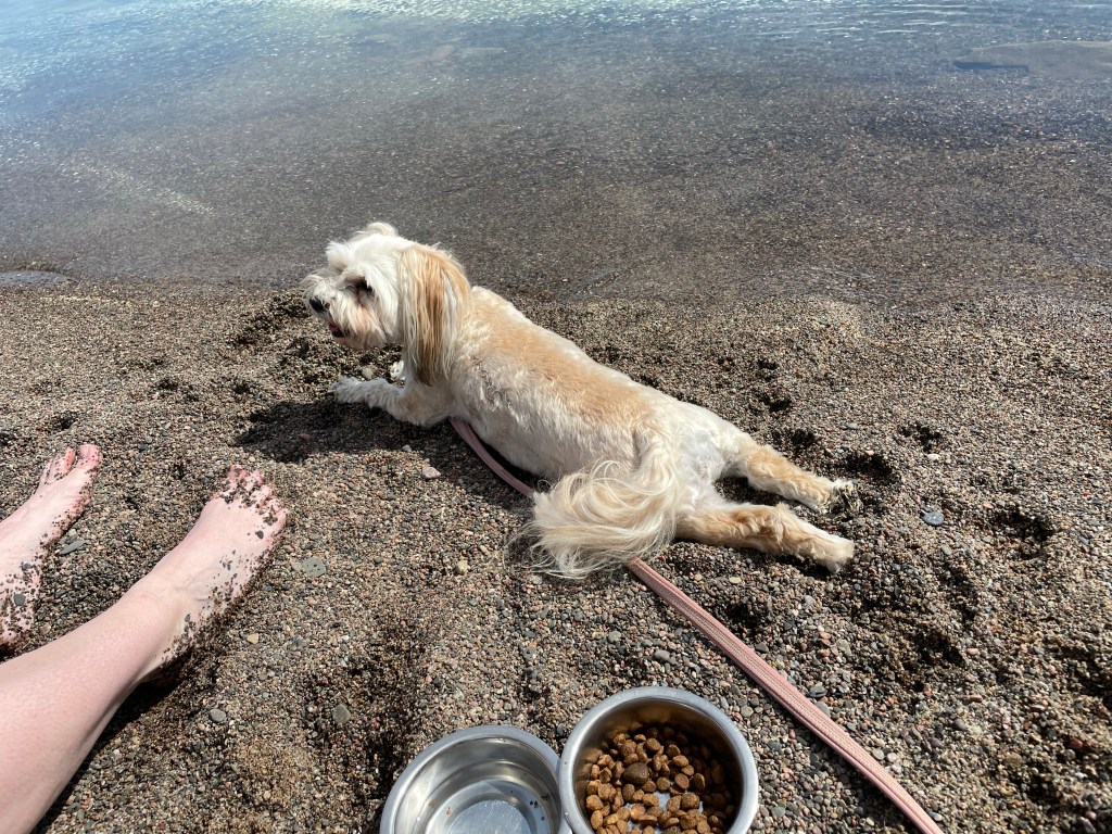 Vi lägger ut vår picnic filt och sätter oss i strandkanten. Chili älskar att springa runt i sanden men ner i vattnet vill hon inte. Konstigt att det kan skilja så på hundar av samma ras. Bingo som älskar vatten och Chili som bara blir sur om man doppar henne.