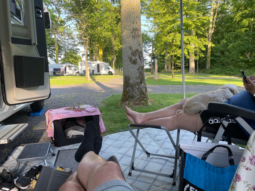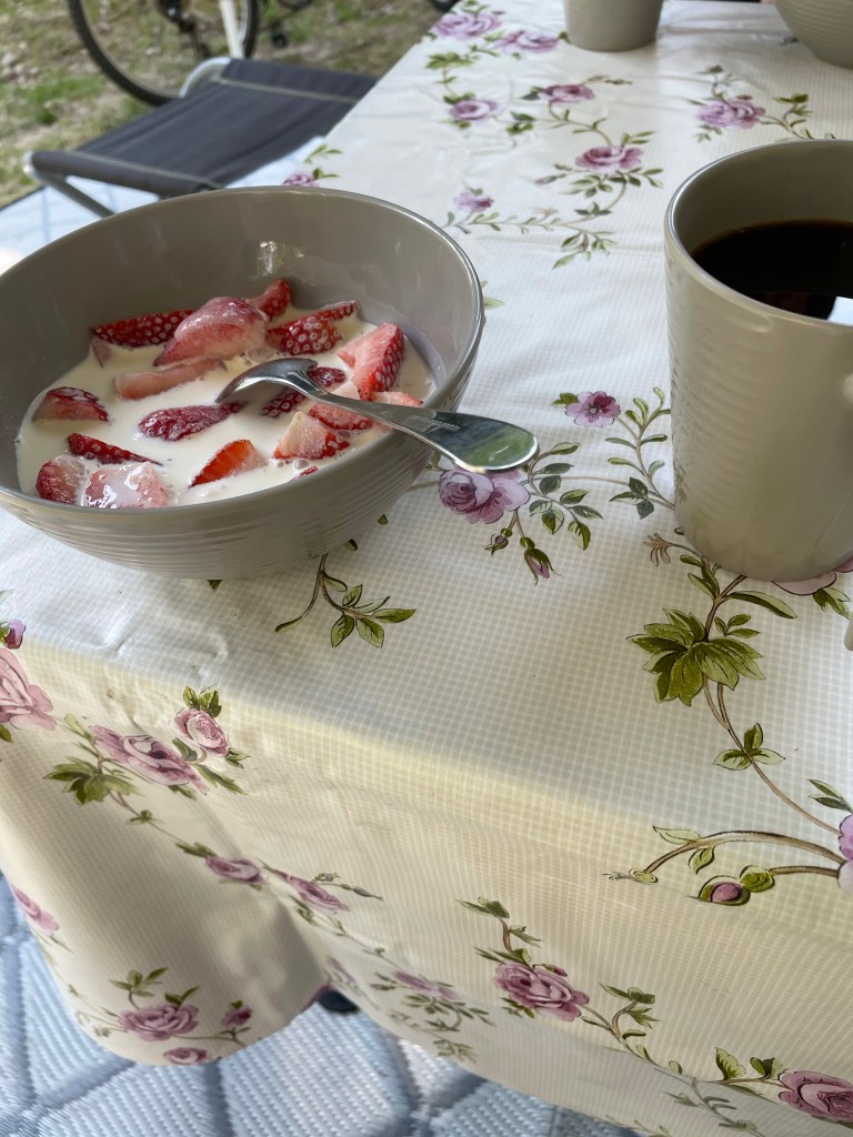 Hemma vid husbilen efter ytterligare 9,8 km cykling så satte jag på kaffe och plockade fram jordgubbar.