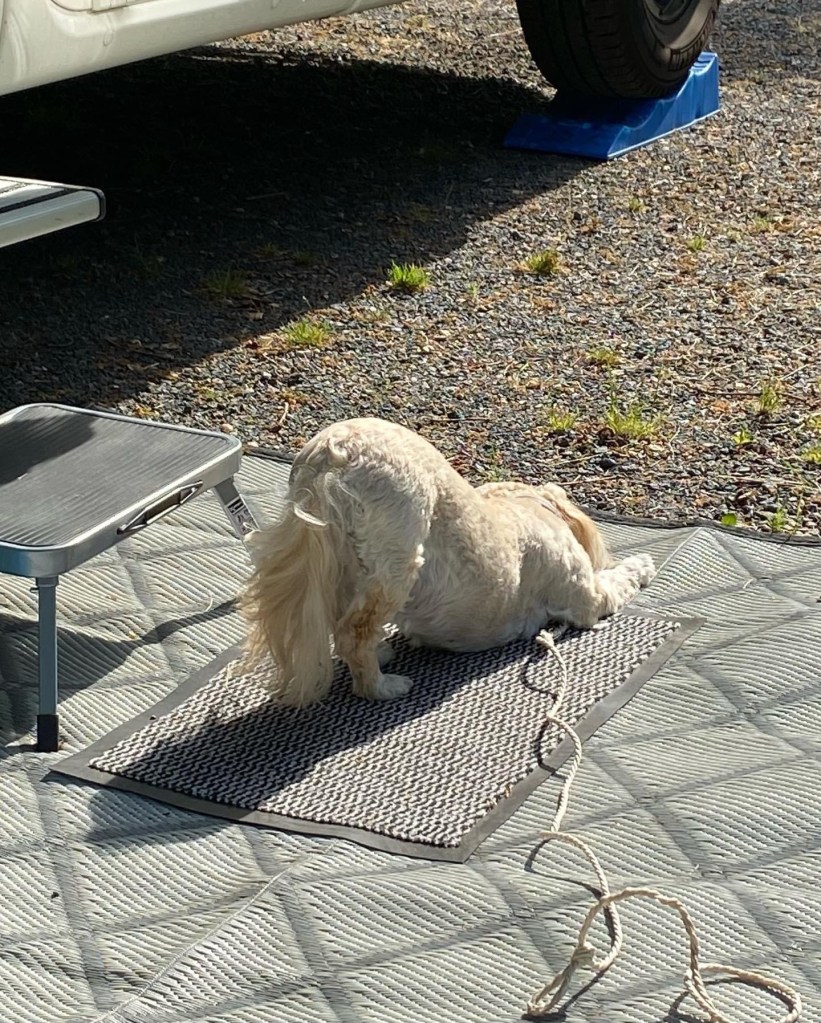Chili gjorde lite yogaövningar på mattan.