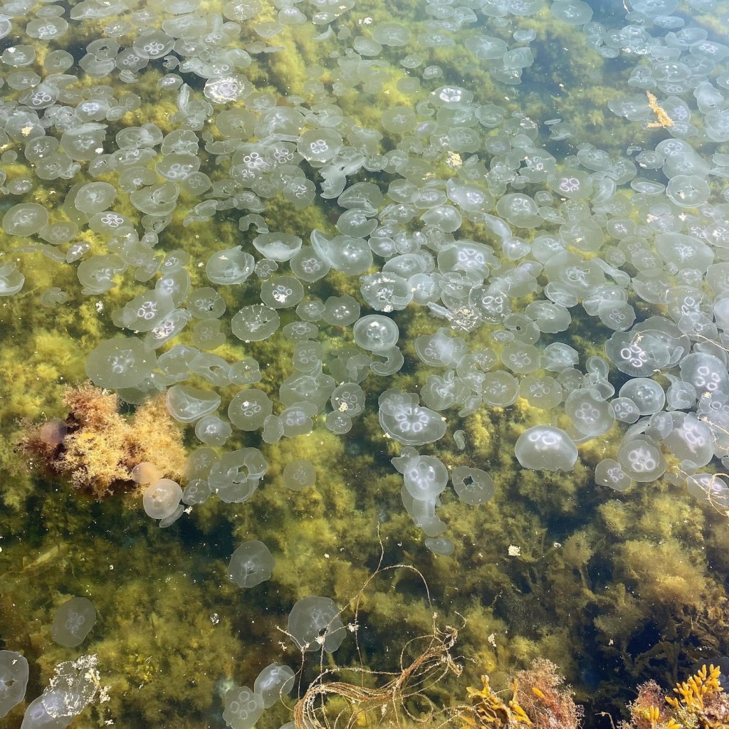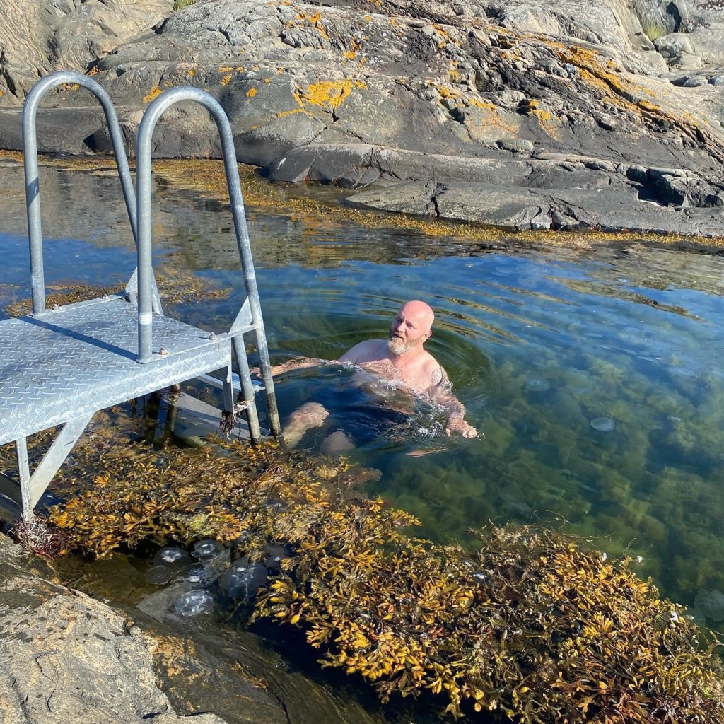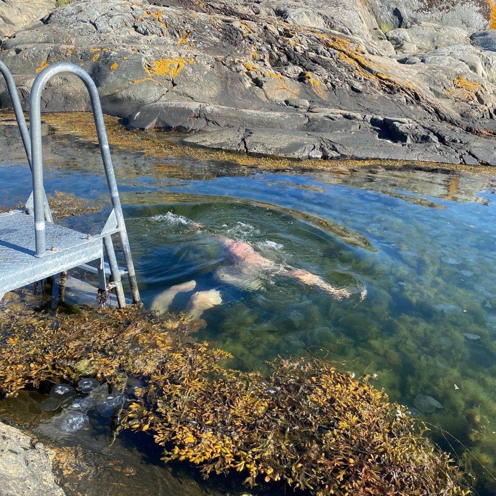 Vi bestämmer oss för att bada. Går ut till en badstege som ligger här. Det är visserligen en hel del maneter i vattnet men det är ju bara vanliga öronmaneter.