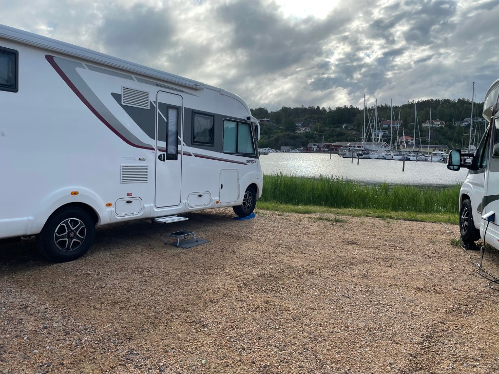 Vi siktar på Henån och anländer dit vid 12 tiden. Får en jättefin plats nere vid vattnet och sätter oss utanför och äter lunch.