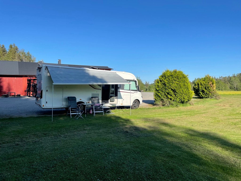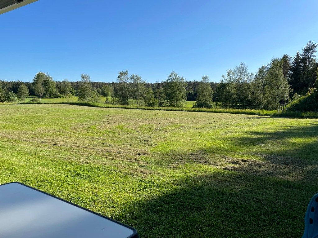 Efter 1 timmas körning så är vi framme vid Kynnesfjäll natur. Jättefin gräsmatta och helt ensamma. Pratar med ägaren som gärna vill klippa gräset först så vi ställer oss i kanten av grusplan så länge och ger oss ut på en promenad.