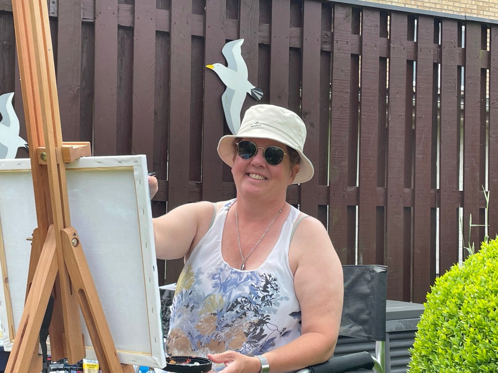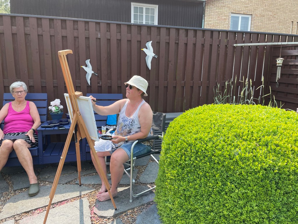 Jag gick sedan ner för att vila lite innan jag tog ett bad i poolen. Britta satt uppe vid dammen och målade.
