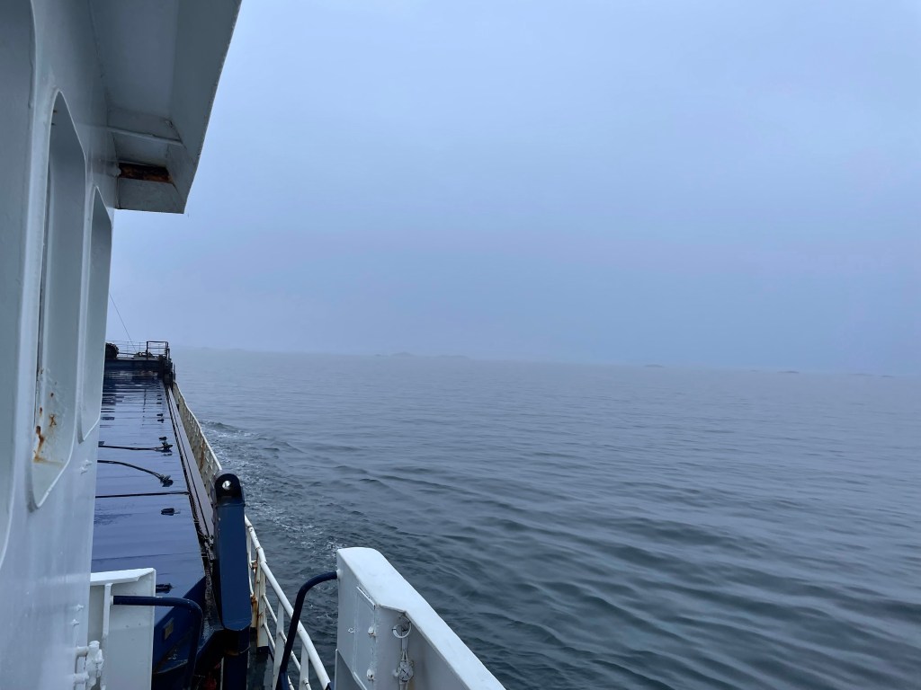 22:00 Avgår och sätter kursen norrut igen. Nu är det nästan vindstilla men dimma istället.