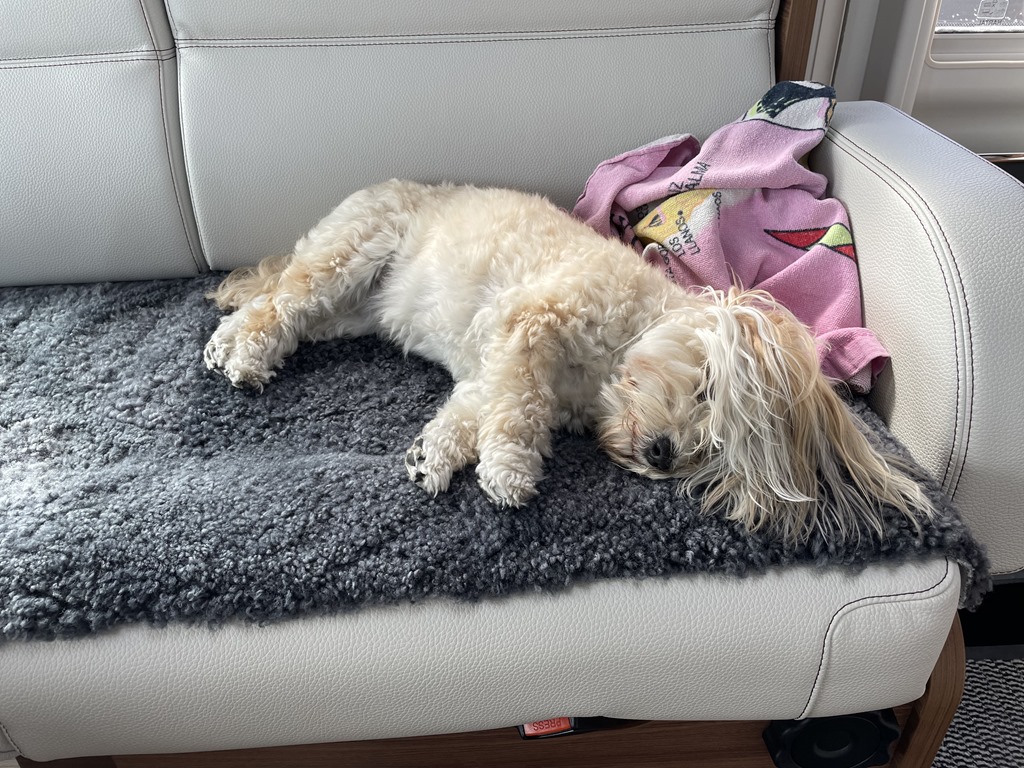 När vi parkerat så äter vi lite pastasallad som jag köpte på Thuressons. Då börjar det ösregna så Chilli lägger sig och slappar.