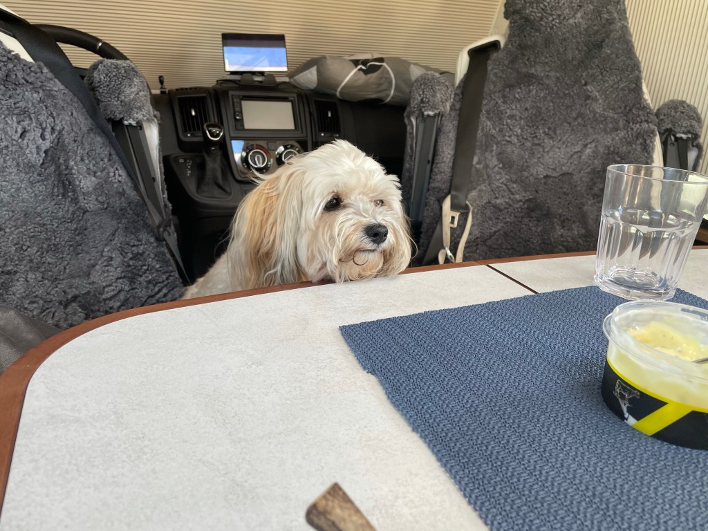 Vi går tillbaka till husbilen för att äta kvällsmat. Här är eldningsförbud så det blir ryggbiff i stekpannan istället. Men det verkar bli lika gott.
