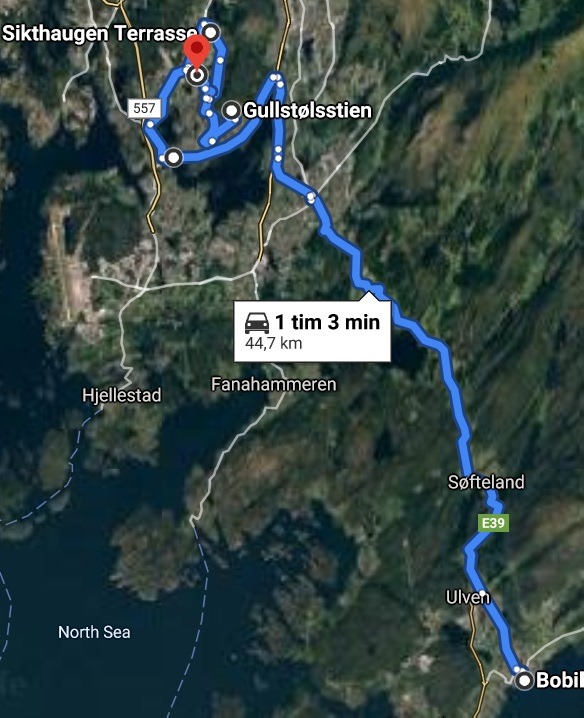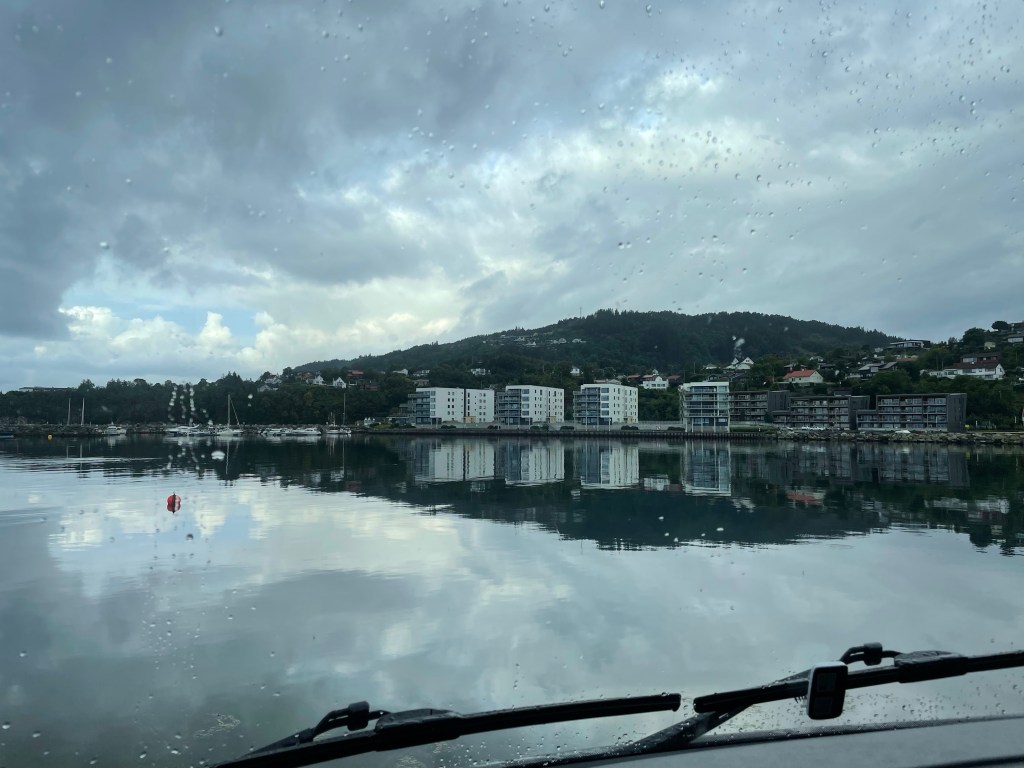 Vi kör sedan vidare mot Bergen. Regnet det öser ner och framme i Fyllingsdalen så letar jag upp en plats vid en skola där vi kan parkera en stund.