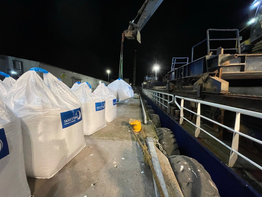 18:35 Påbörjar lastningen. Vi skall tydligen ha 1800 Big bags. Ja vi får väl se om vi får plats med det.