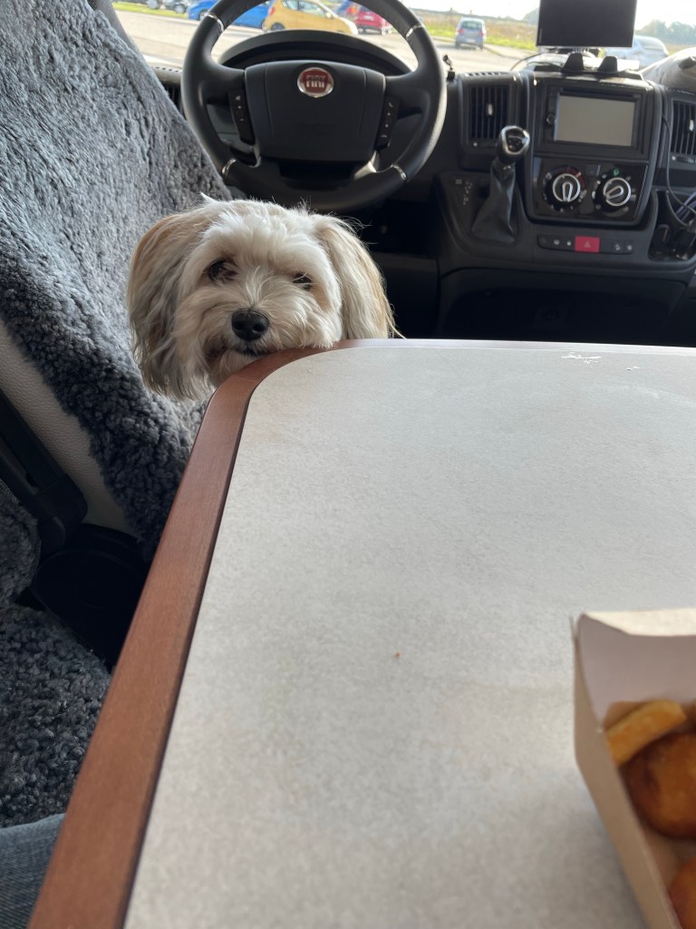 Där stannar vi och rastar Chilli och jag går för att köpa varsin portion fish and chips.