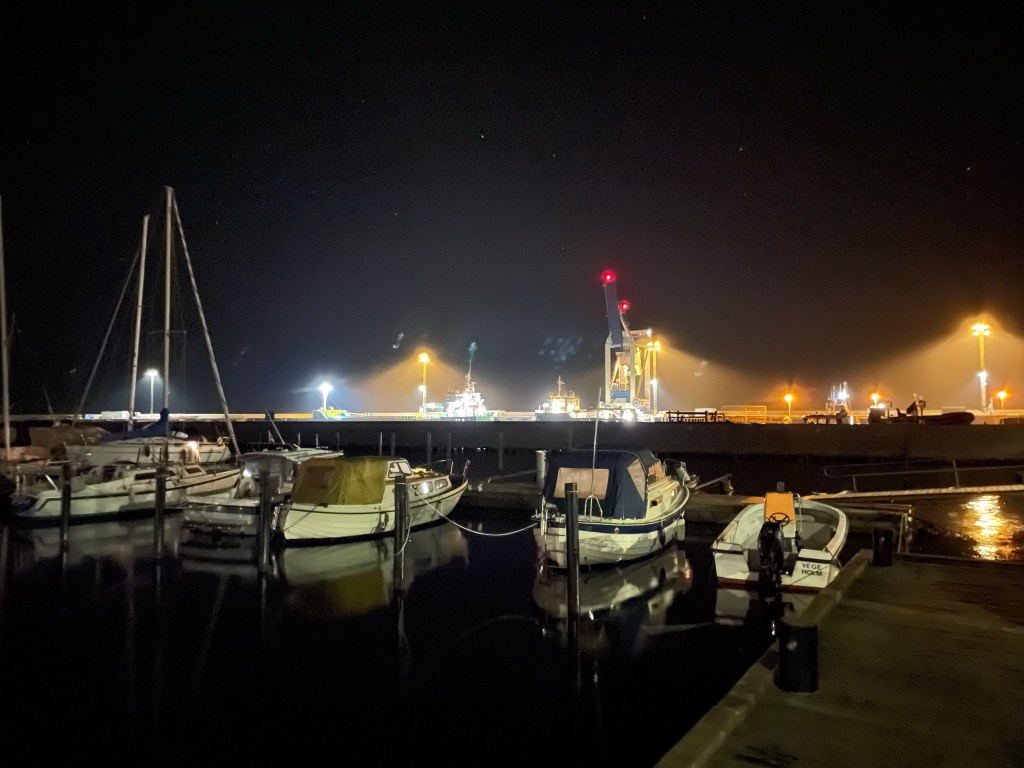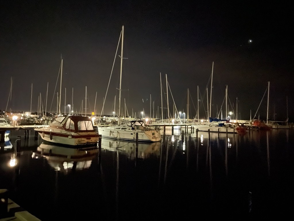 Jag tog en sista kvällspromenad med Chilli i hamnen.
