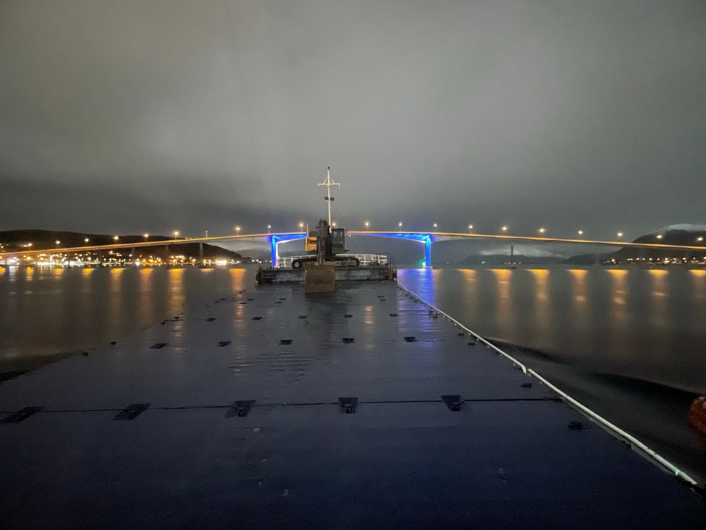 20:00 Går ut på kajen och hjälper till med lastningen.
