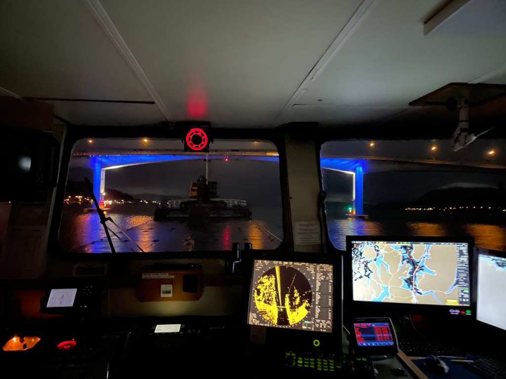 13:00 Lastat ombord 824 big bags och lämnar kaj eftersom det kommer en båt som har förtur till lastning.