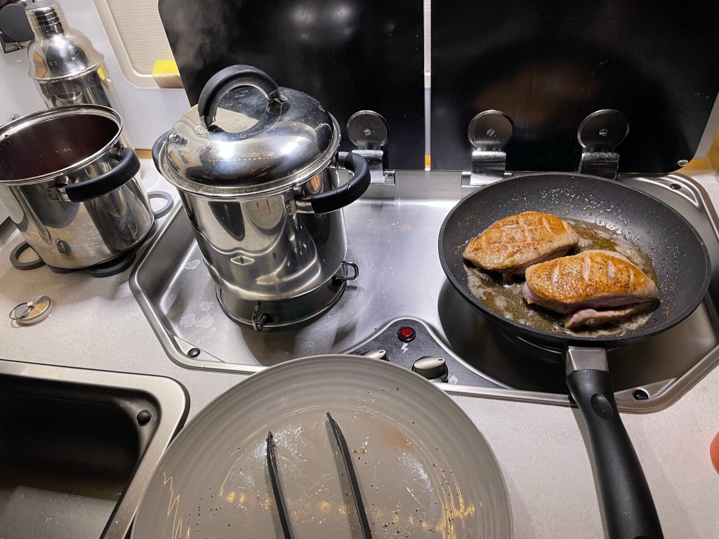 Till kvällen så blev det Ankbröst med kronärtskockspure och rödvinssås.