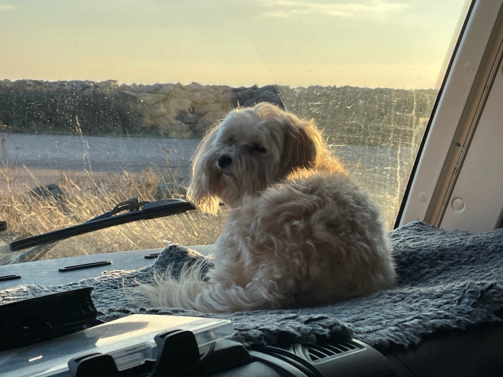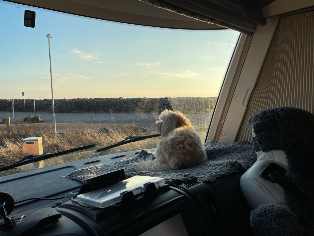 Tillbaka i husbilen så tog jag lite kaffe och fika. Chili låg och spanade.