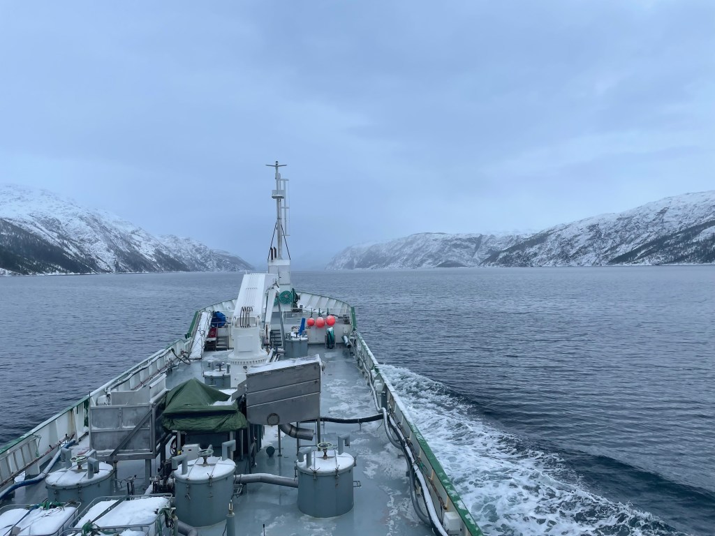 01:00 Förtöjda i Brønnøysund i full snöstorm. Går och lägger mig.