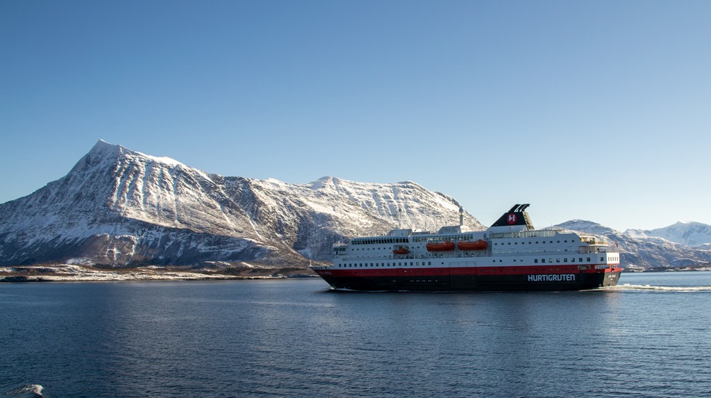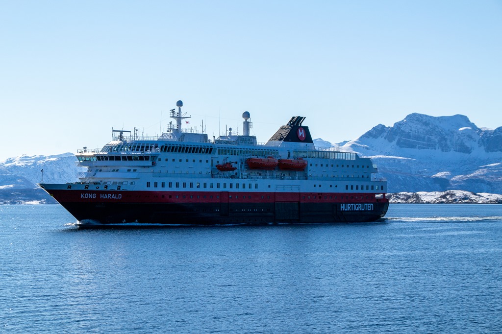 Passerar Bodö och Fuglöy där vi möter Hurtigruten Kong Harald.