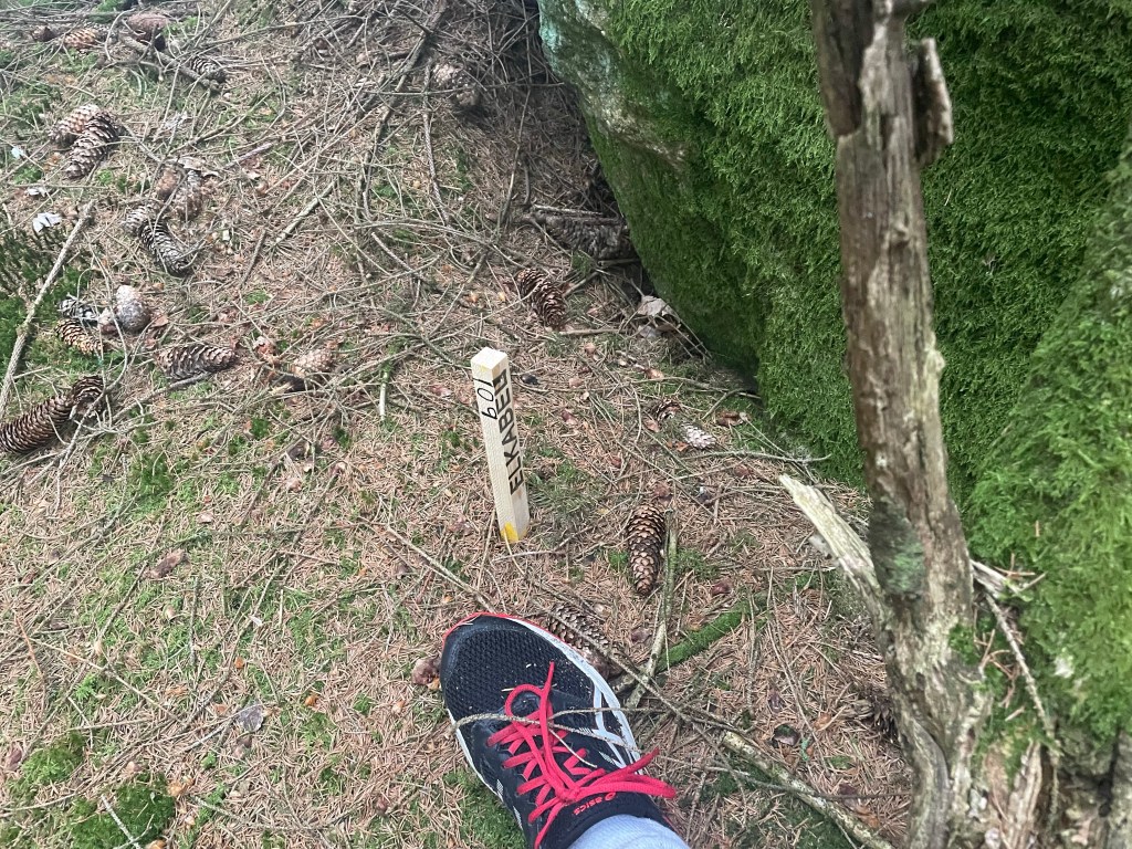 Så vi provsprang eller rättare sagt gick en D75 bana. Den var 3,1 km lång men vi gick totalt ca 4 km. Man får ta det lugnt om man skall hitta de små pinnarna som markerar var kontrollen skall sitta.