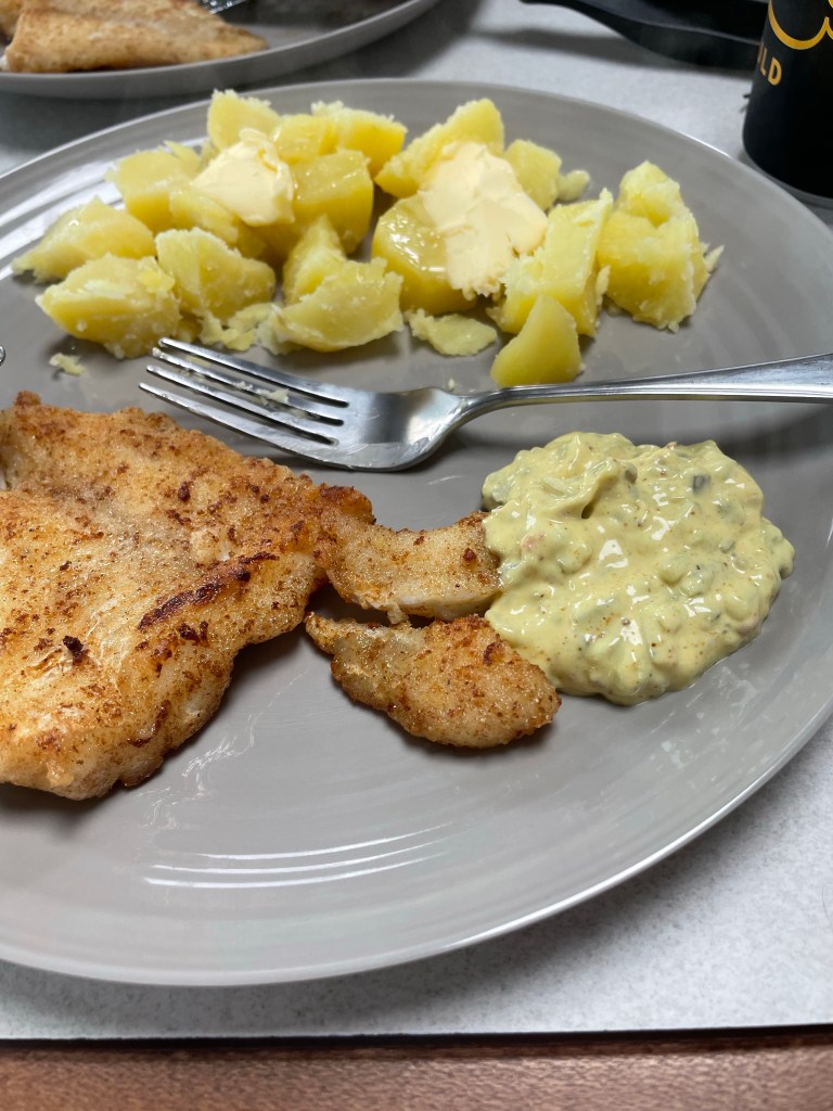 Till kvällen blev det stekt torskfilé med potatis och hemmagjord remouladsås.