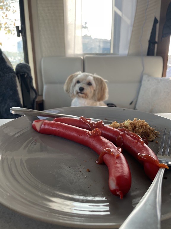 Värmde lite Röd Pölse till lunch när vi kom fram.