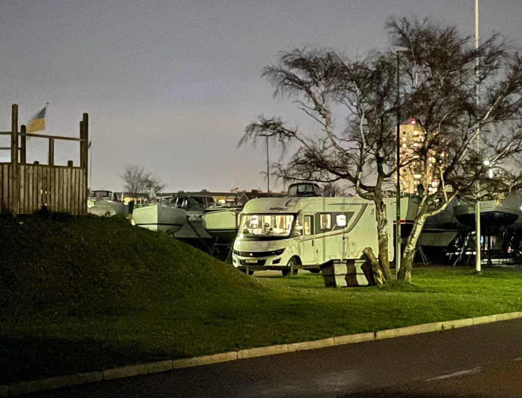 När vi kommer till Sverige så kör vi till Höganäs. Är bara 4 platser nu eftersom resten är fulla av båtar. Men det var bara 1 husbil här.