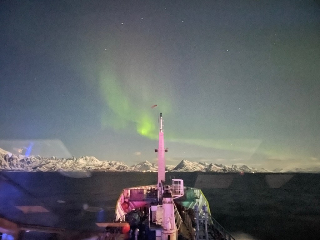 Vinden avtar under eftermiddagen och när jag går av vakten uppe i Raftsundet så är det riktigt fint och lite norrsken.