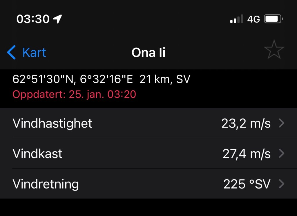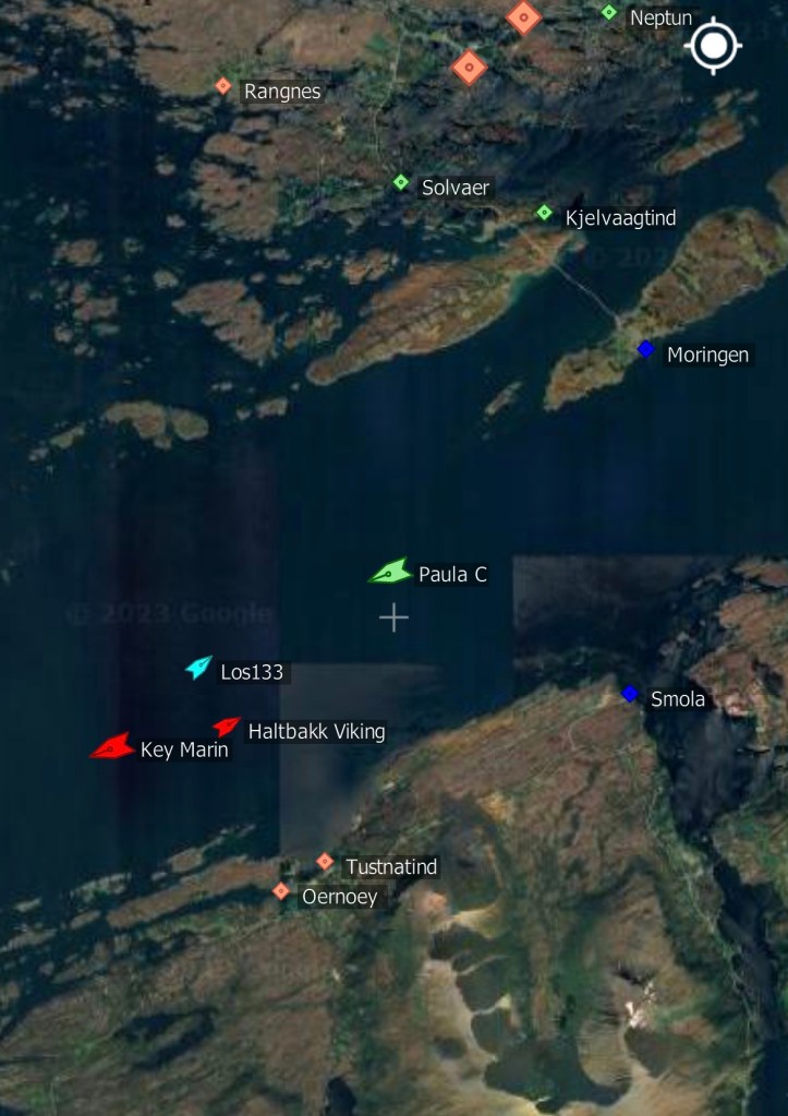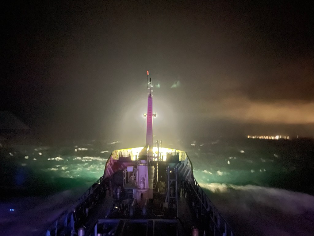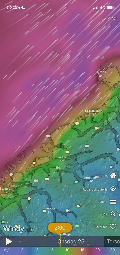 02:30 Avgår från Harøysundet och beger oss ut mot Hustadvika. Vädret är ju inget vidare nu med nästan 30 m/s i byarna.