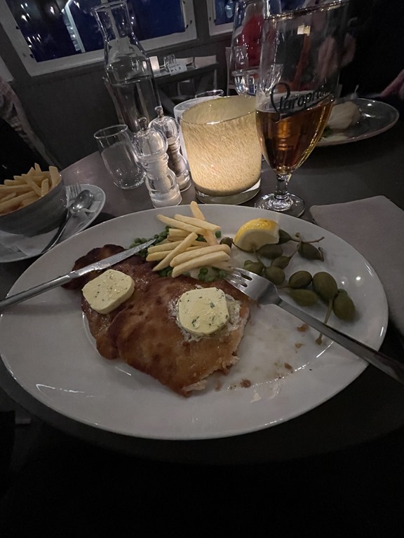 Till kvällen så gick vi på Solviken och åt riktigt god mat. Jag tog en Schnitzel och Britta tog Torsk.