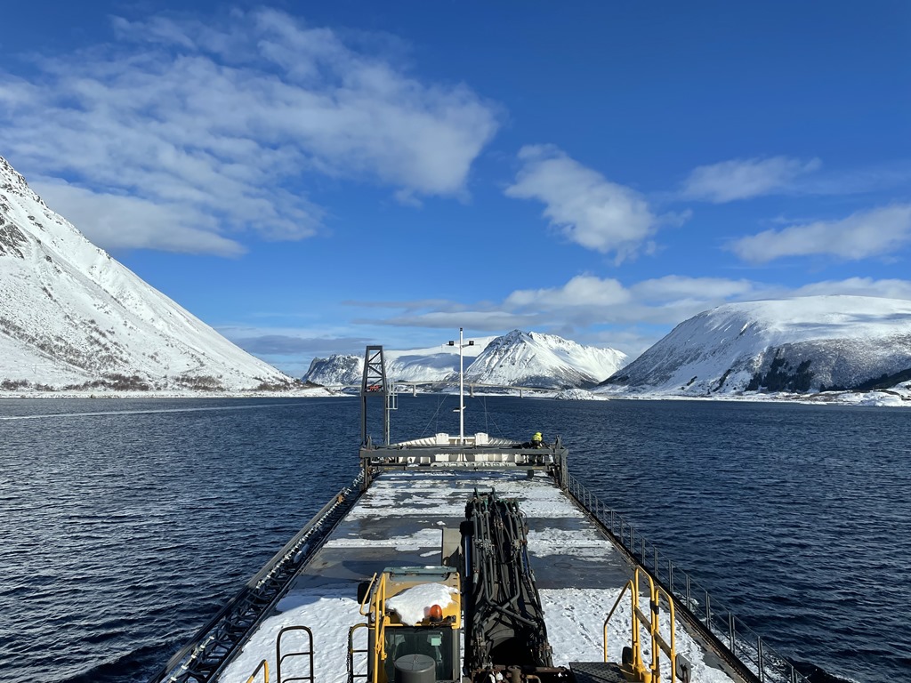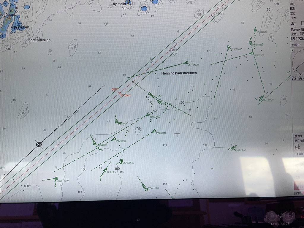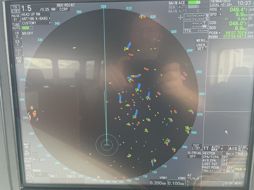 01:45 Närmar oss Leknes och det blåser 15-18 m/s men nu är vi snart full besättning på däck och bryggan