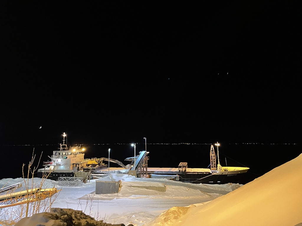 14:00 Går av vakten och det snöar en hel del. Men båten är färdig lastad och vi skall inte lossa innan på måndag morgon.