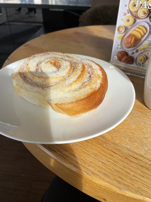Går bort till Baker Brun på bryggen och tar en kopp kaffe och en skillingsbolle.