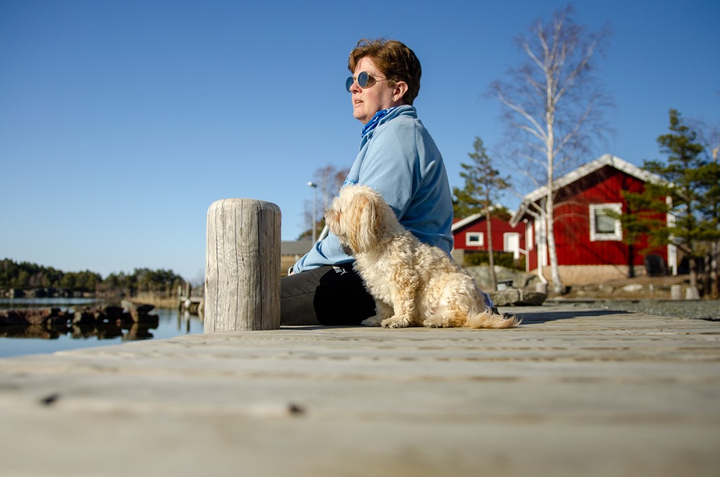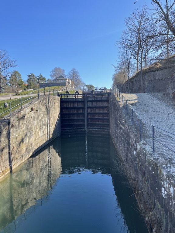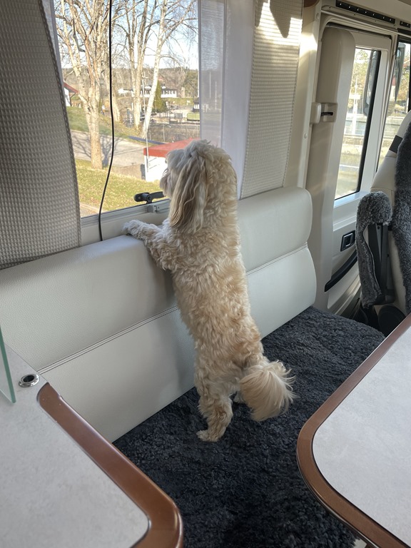 Efter frukost denna soliga fina morgon där Chili spanar på omgivningarna så tar vi en promenad runt slussarna.
